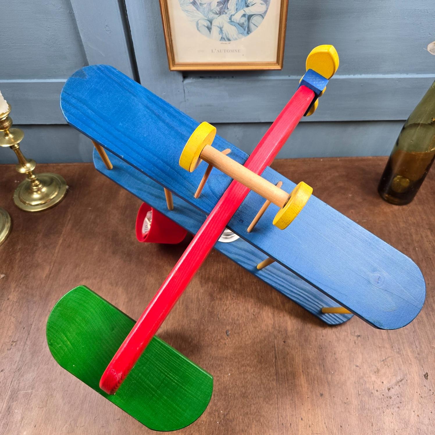 Suspension vintage en forme d’avion biplan en bois peint, aux couleurs vives et joyeuses : rouge, bleu, jaune et vert.