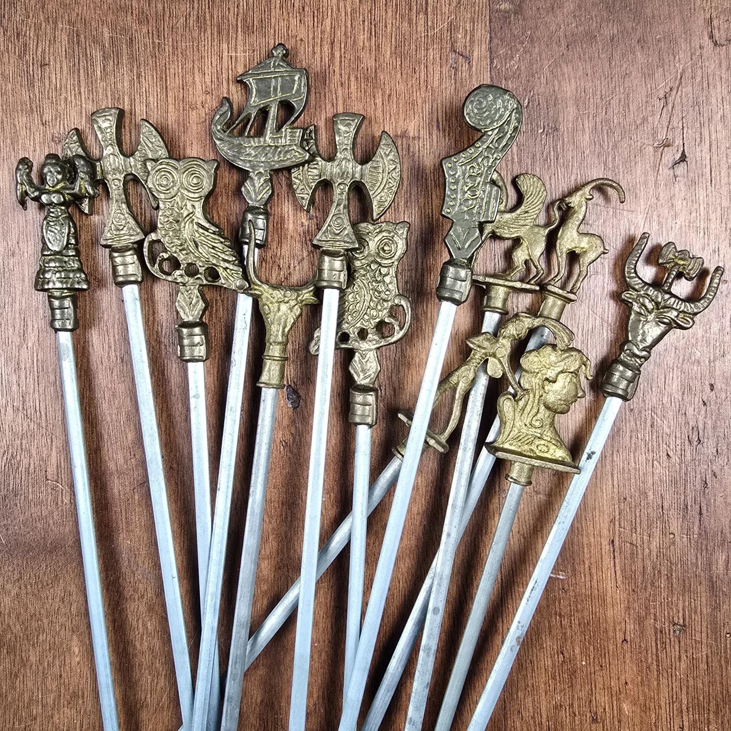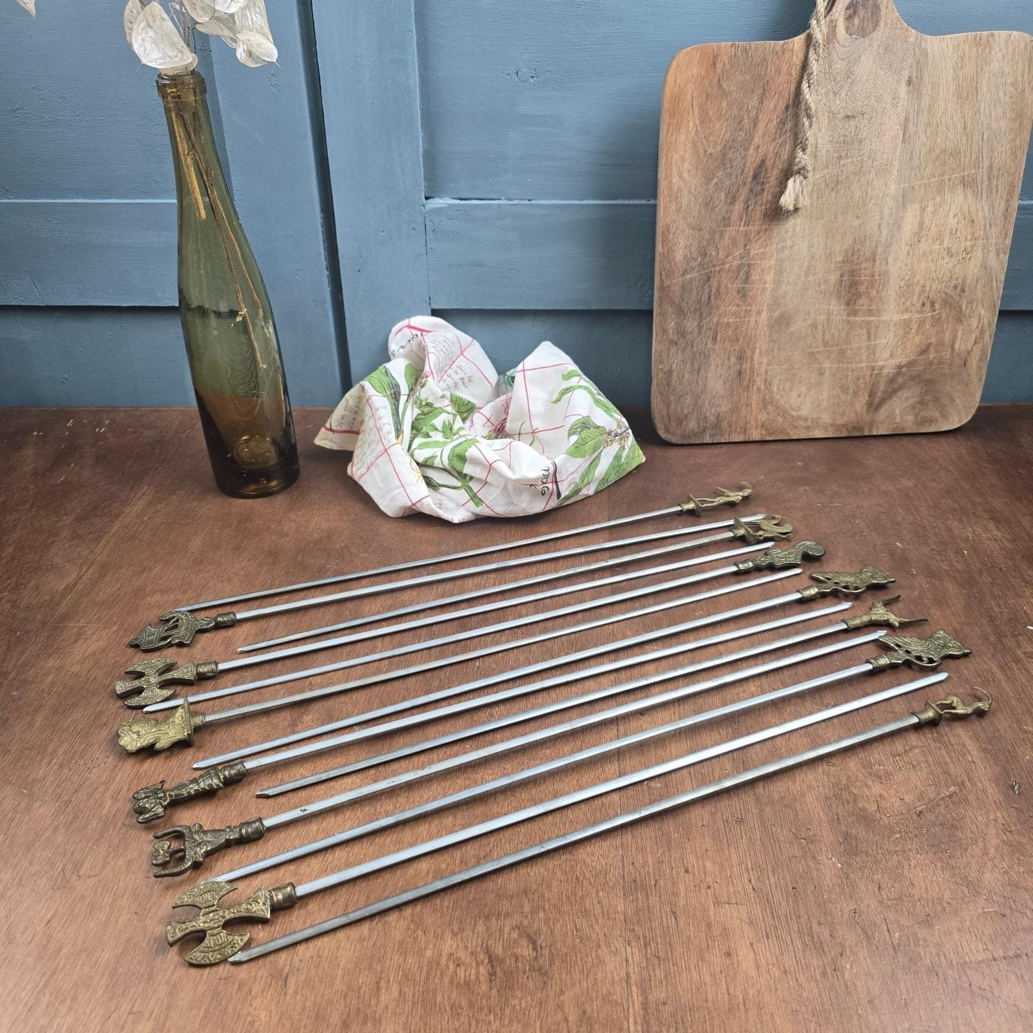 Lot de 13 brochettes anciennes en métal et laiton – Pics barbecue décoratifs
