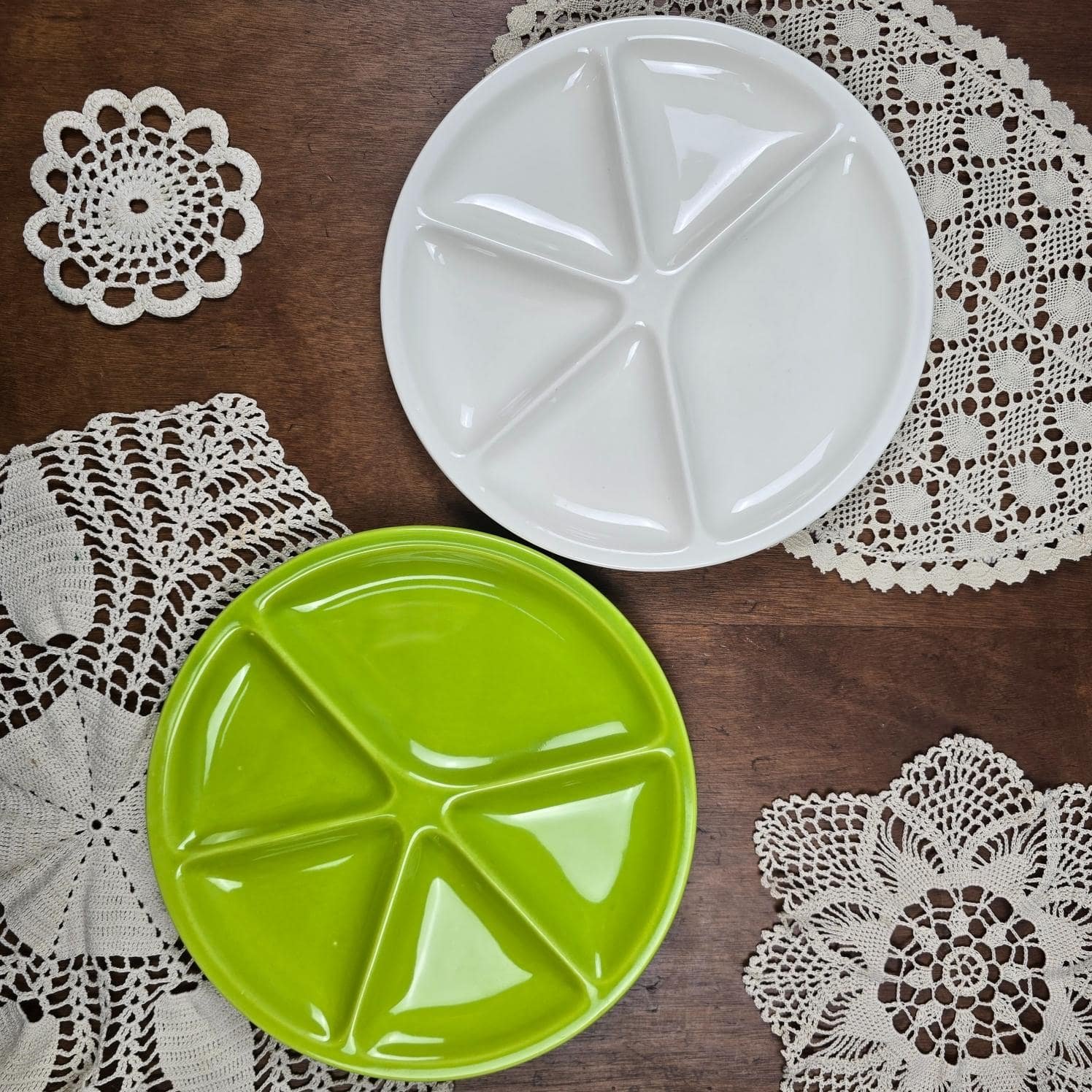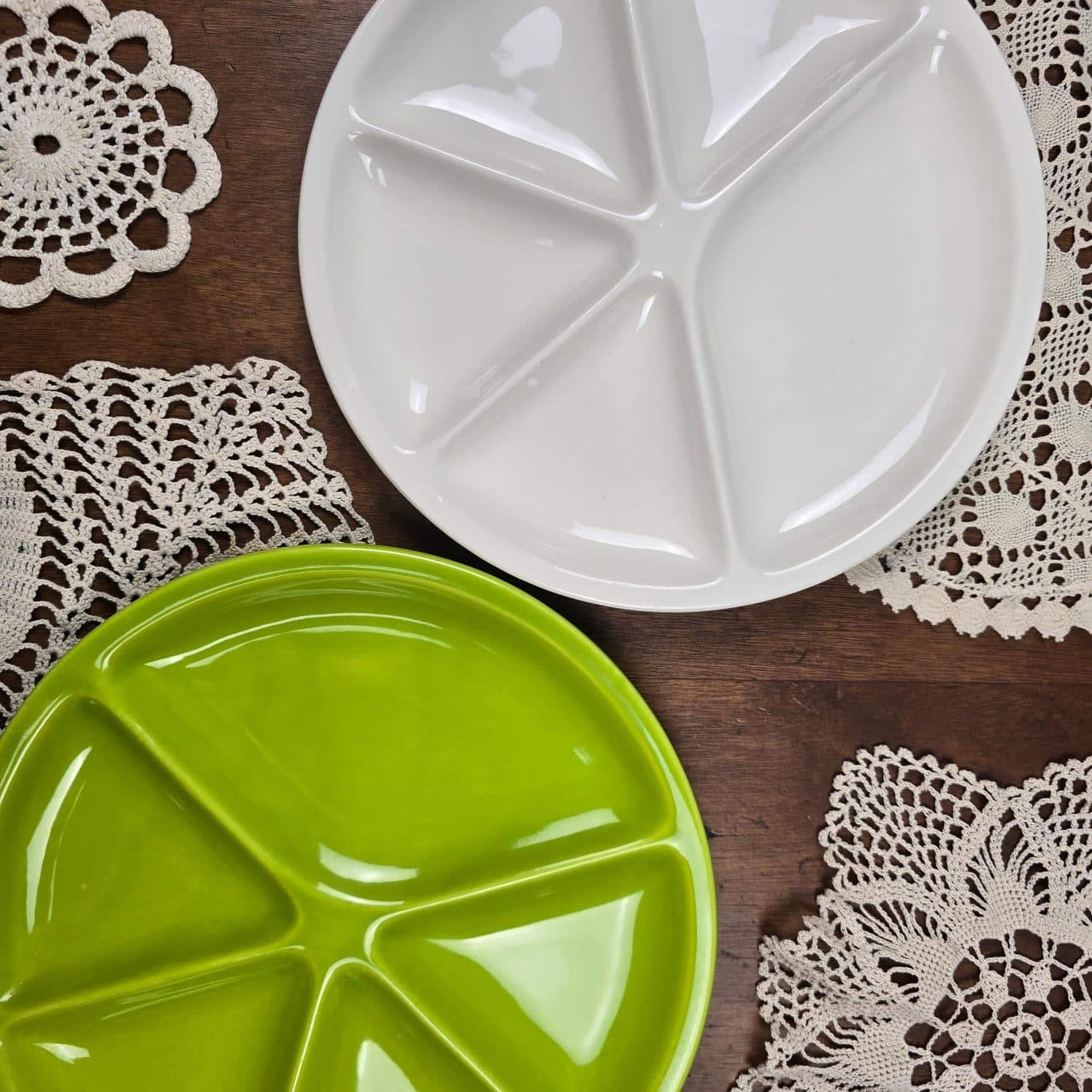 Ces deux grandes assiettes compartimentées, l’une d’un vert vif lumineux, l’autre d’un blanc crème intemporel, sont de véritables invitations aux repas conviviaux : fondue savoyarde, apéritifs généreux, crudités colorées, tapas ou dégustations à partager.