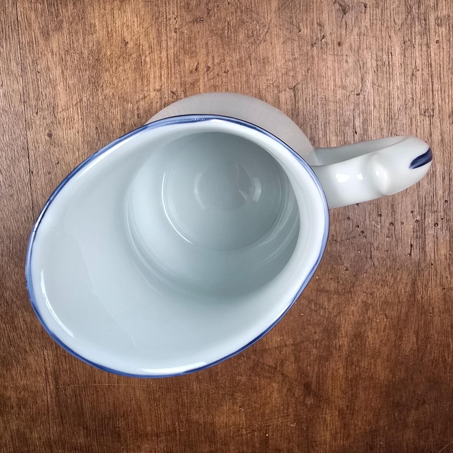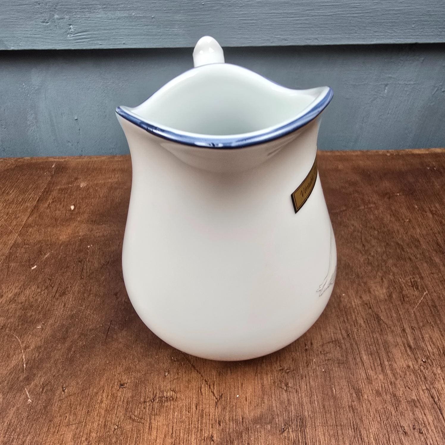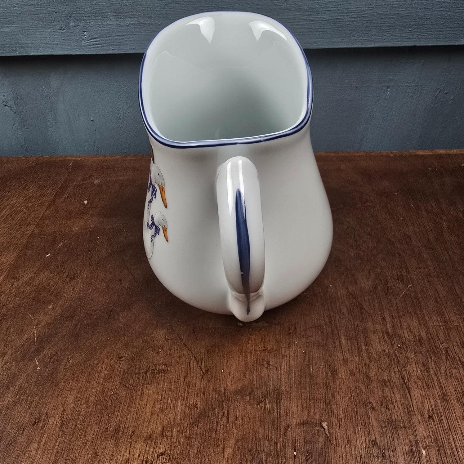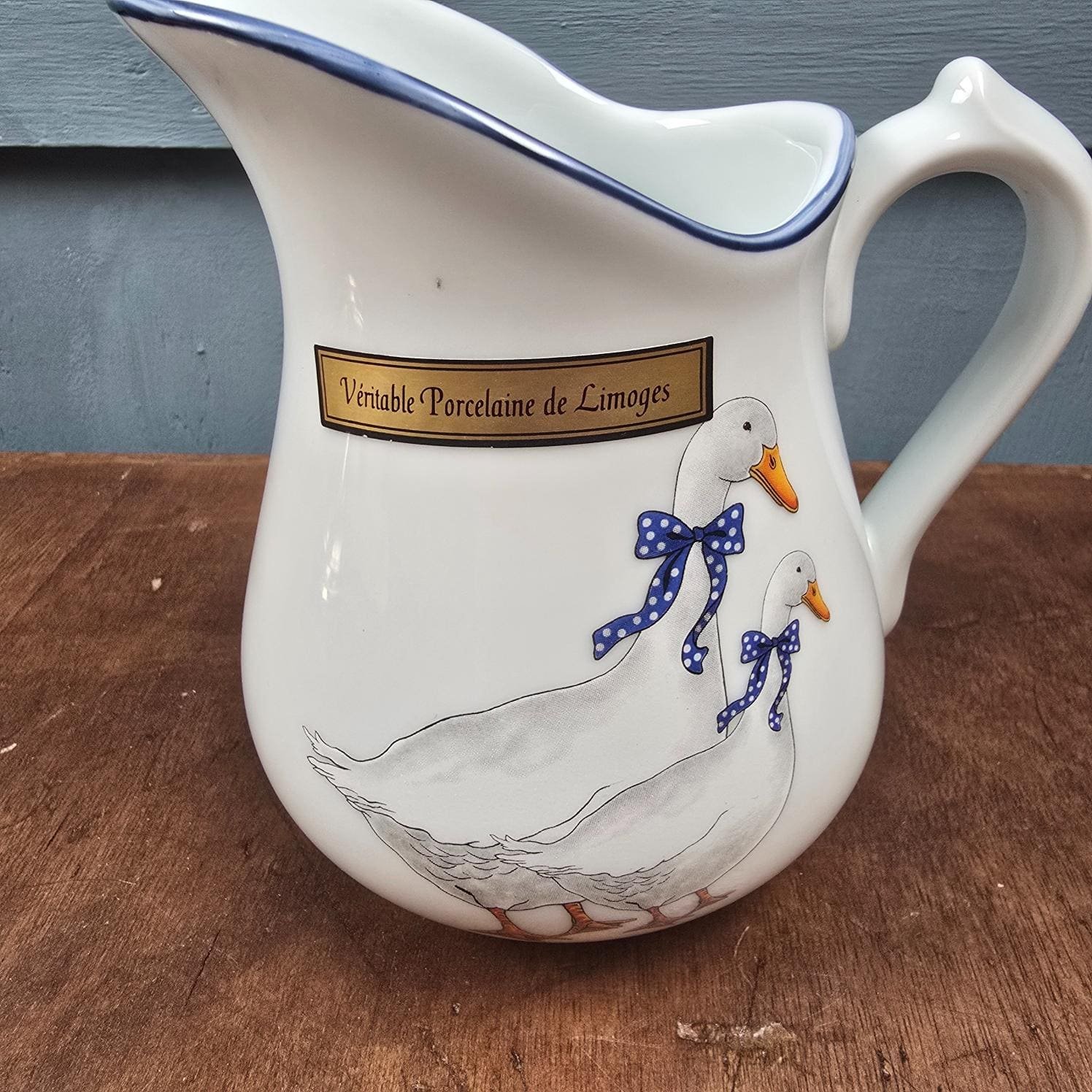 Joli pichet en véritable porcelaine de Limoges, décoré de deux oies aux nœuds bleus.
