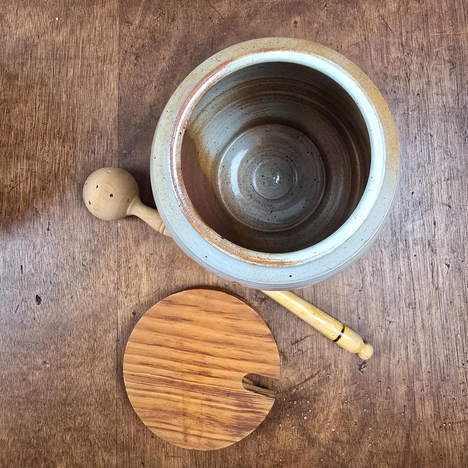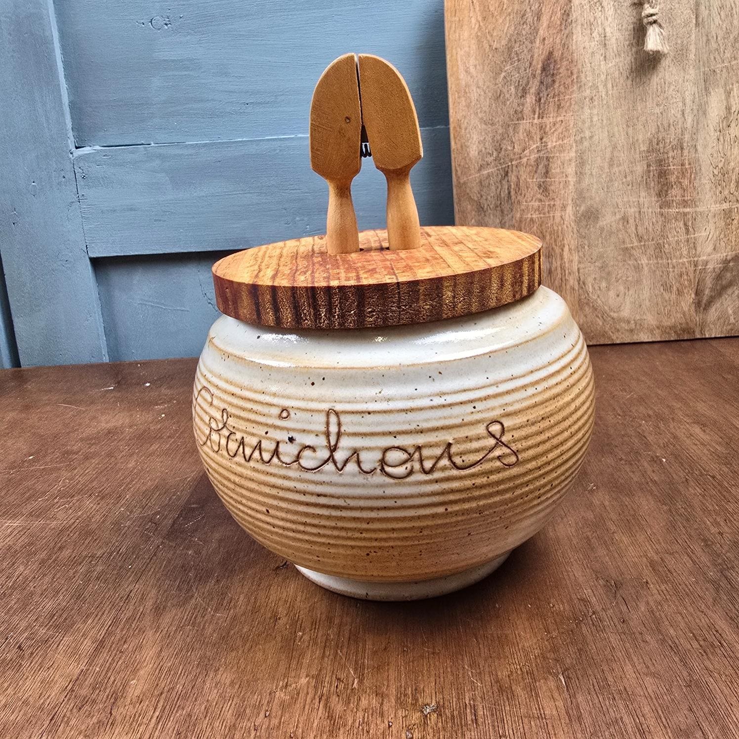 Le tout en grès beige moucheté, à l’émail nuancé et aux inscriptions manuscrites brunes. Les couvercles et supports en bois apportent une touche rustique très décorative.