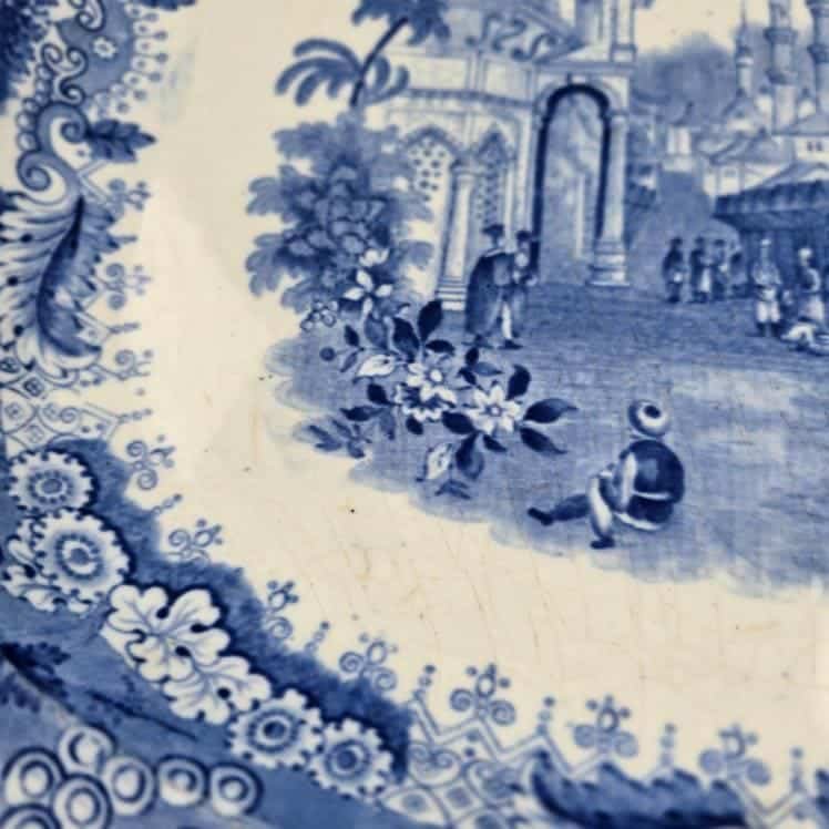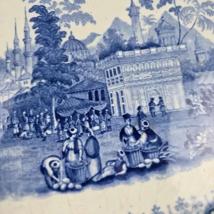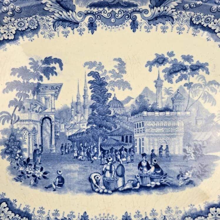 Au centre, une scène animée aux accents exotiques : architectures élancées, silhouettes en mouvement, végétation luxuriante… Un paysage inspiré de l’Orient, tel qu’il fascinait l’Europe du XIXe siècle.
