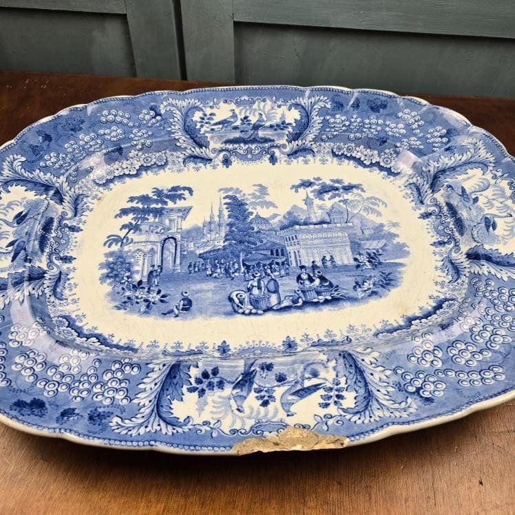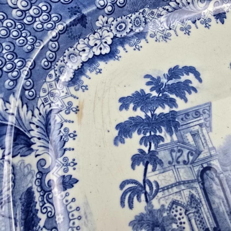 Grand plat ancien Jules Vieillard Bordeaux, décor bleu oriental en Terre de fer – Format XXL – Fin XIXe