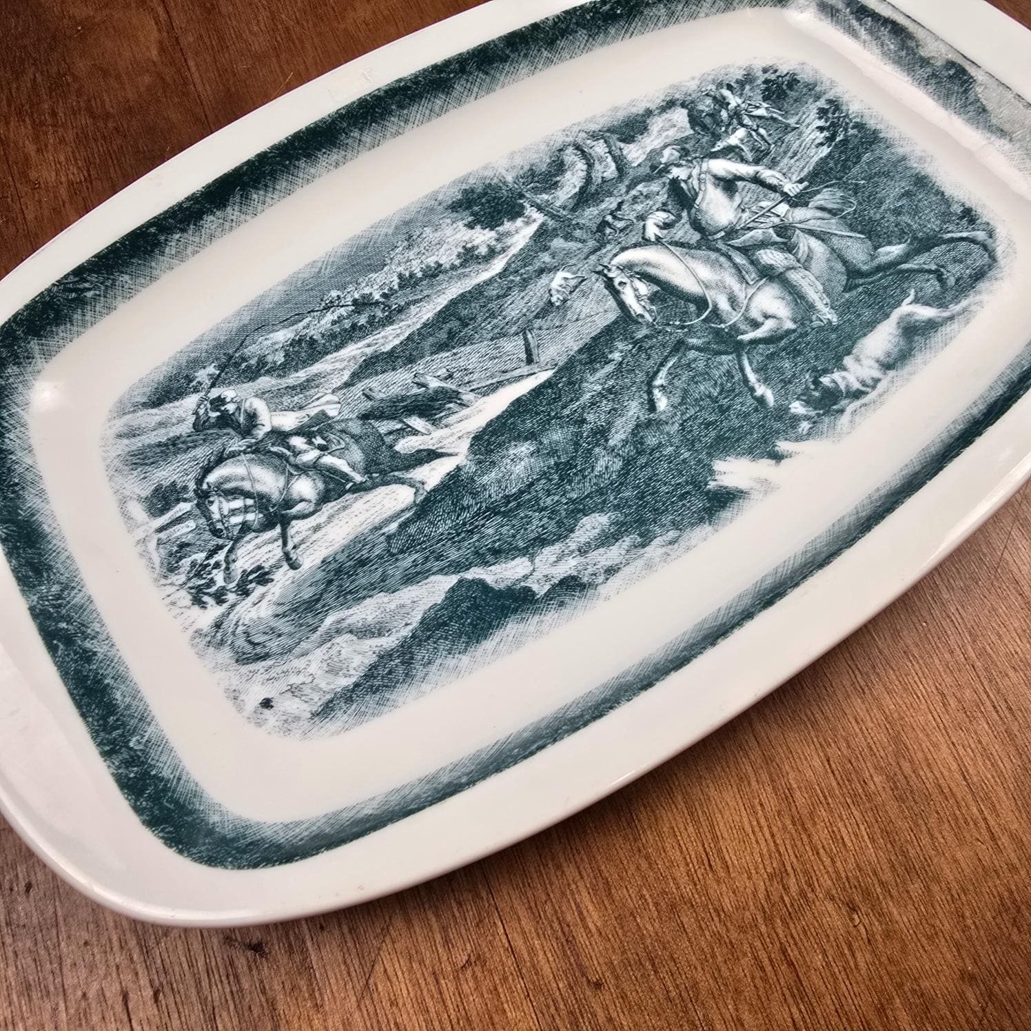 Petit plat rectangulaire en porcelaine allemande Bavaria, orné d’un décor de chasse dans des tons verts profonds, inspiré des gravures classiques.