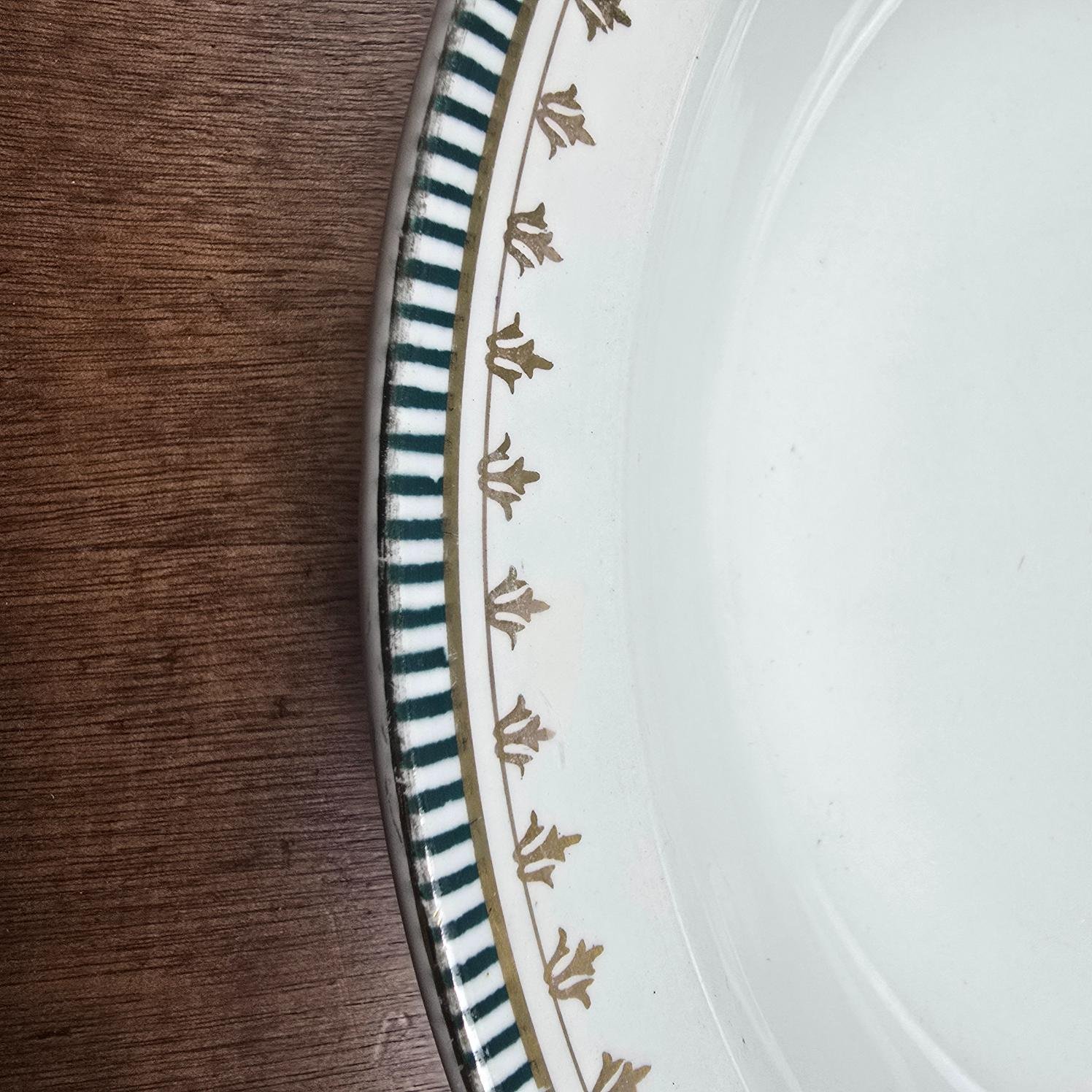 Réalisé en véritable opaque, un matériau emblématique des grandes manufactures, il séduit par son décor graphique mêlant filets vert bouteille et motifs dorés stylisés, une combinaison très caractéristique des productions des années 1930 à 1950.