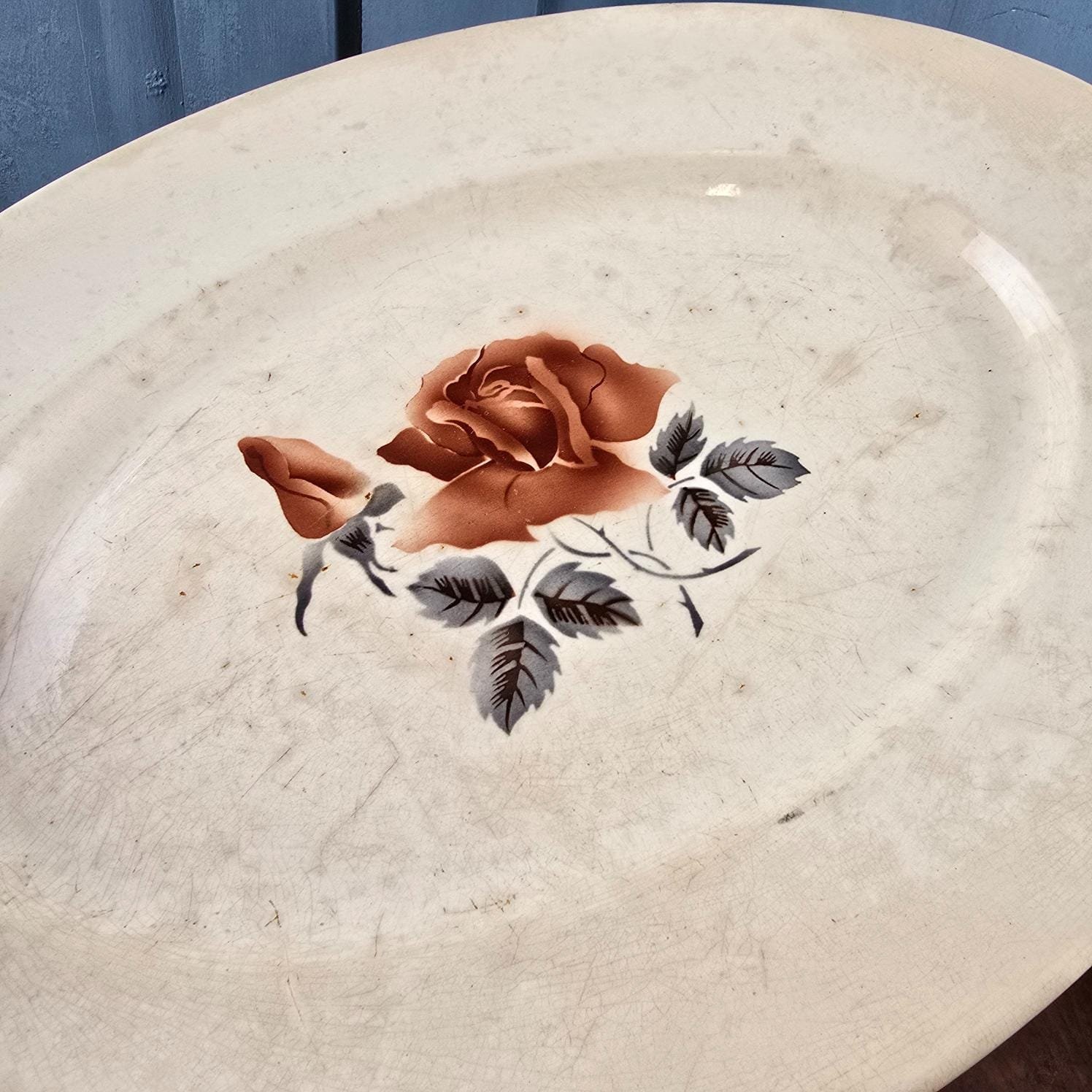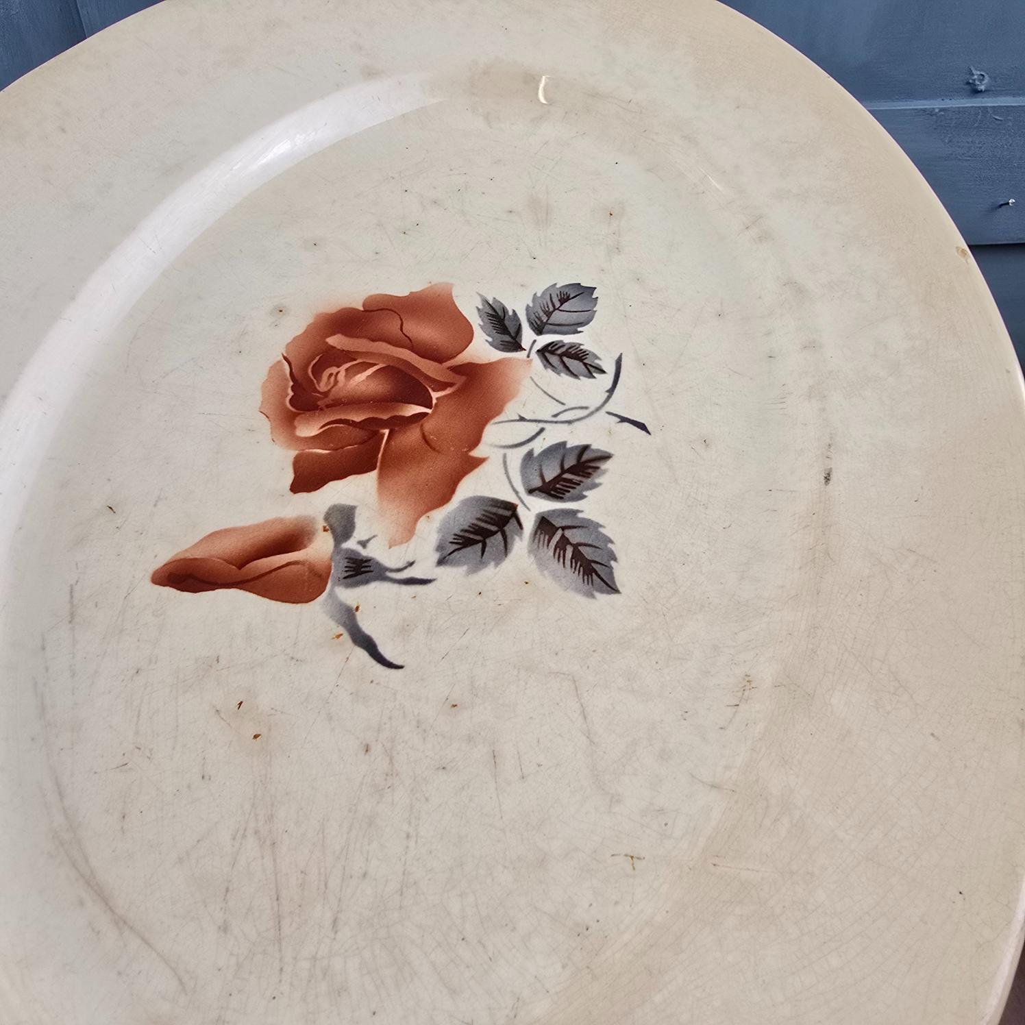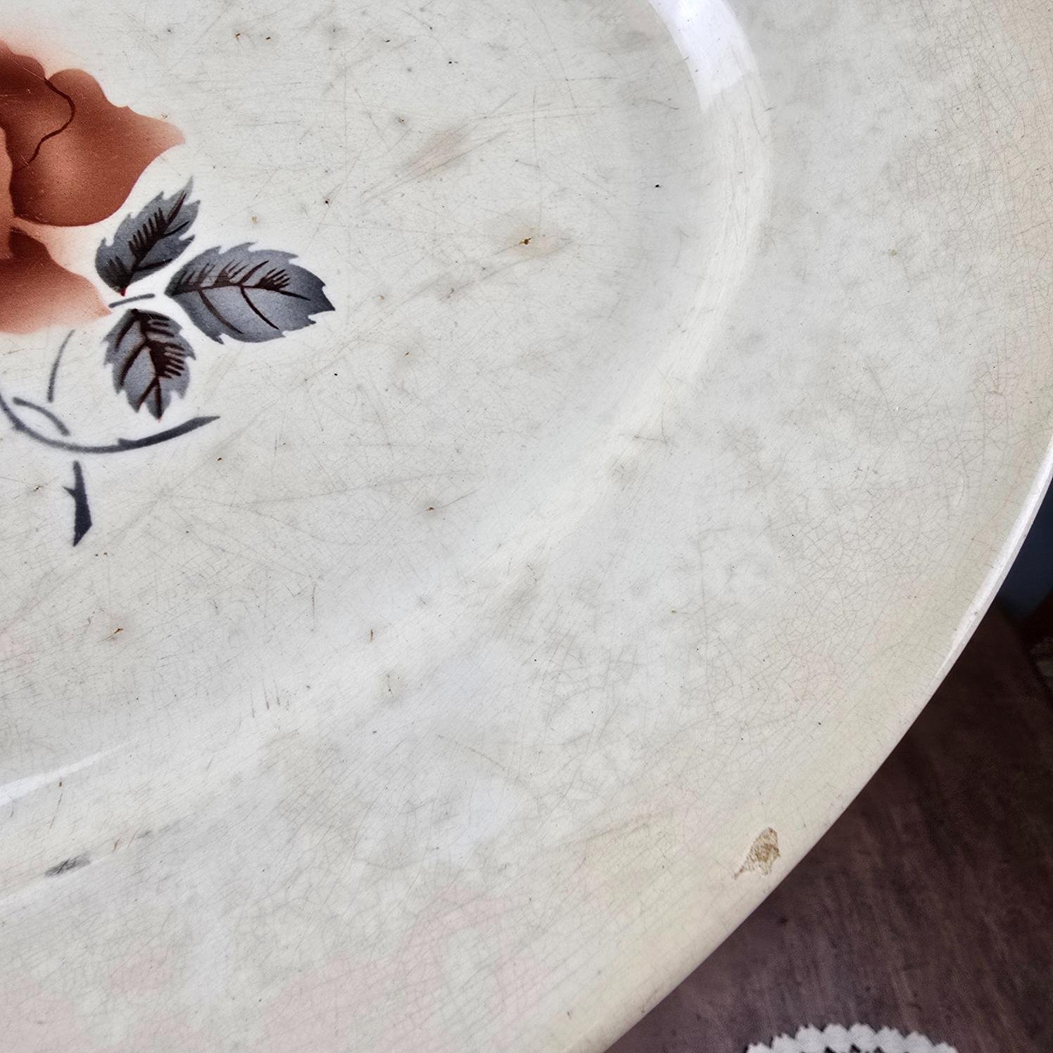 Ce grand plat ovale signé Digoin & Sarreguemines séduit immédiatement par son décor délicat de rose, posé sur une faïence aujourd’hui marquée par le temps.