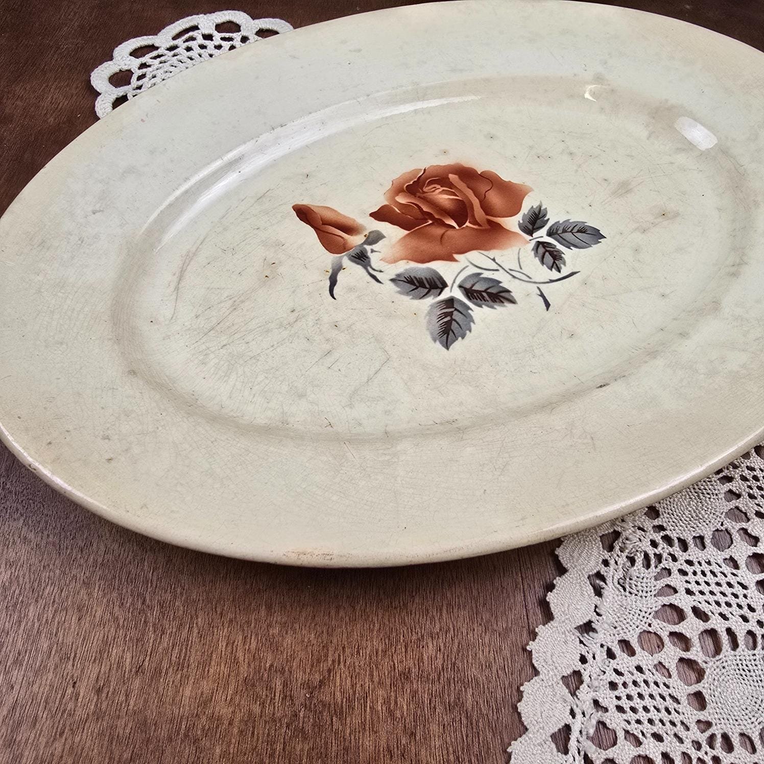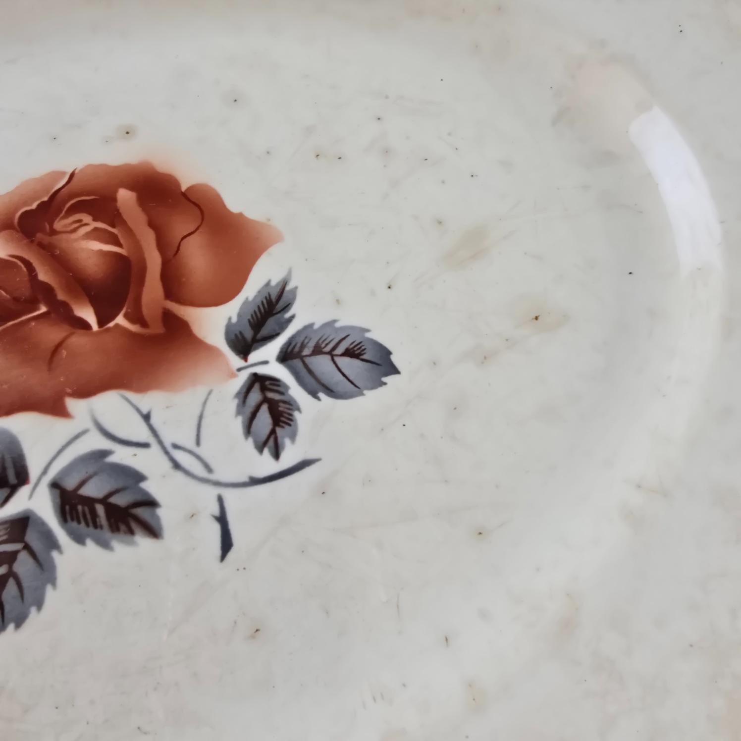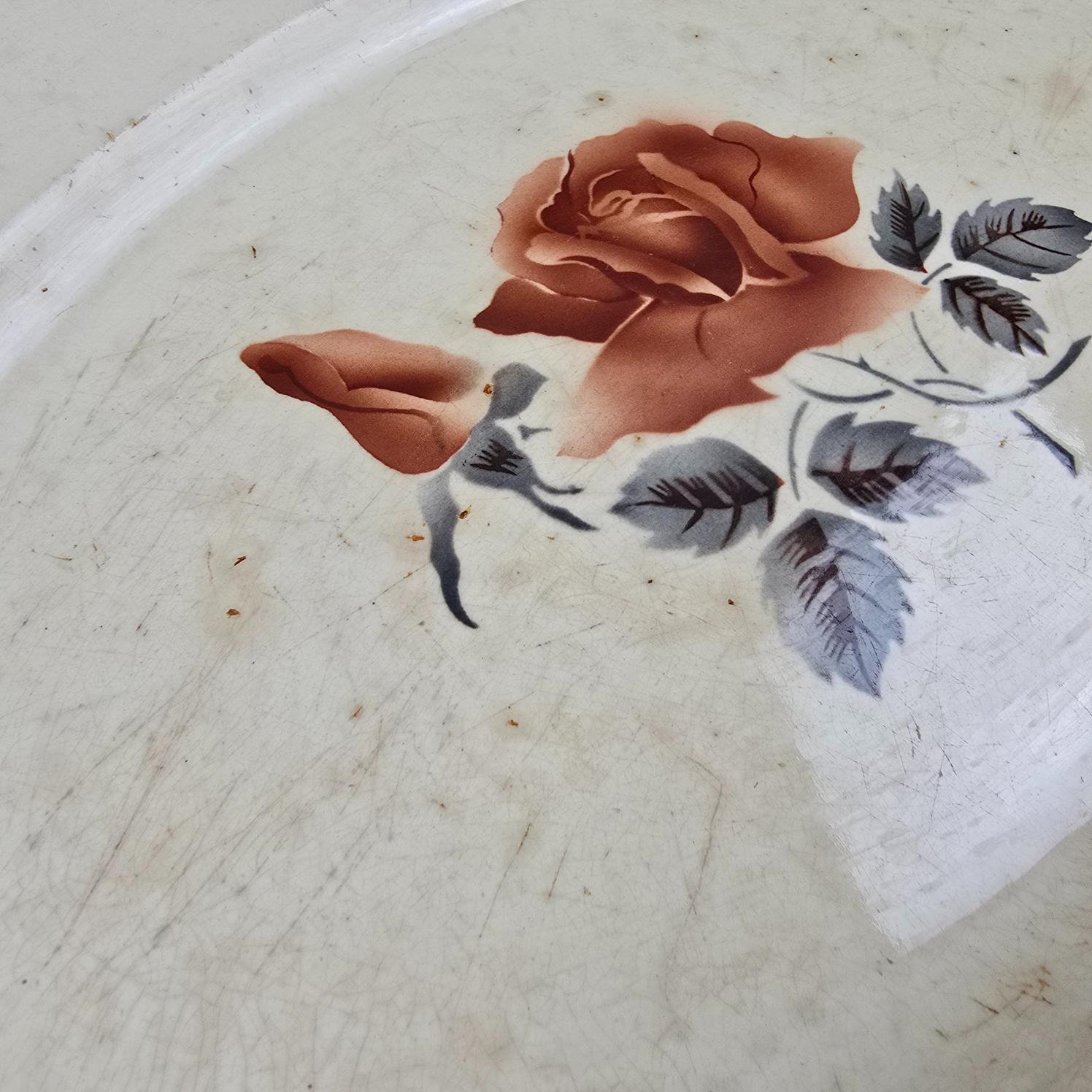 Ce grand plat ovale signé Digoin & Sarreguemines séduit immédiatement par son décor délicat de rose, posé sur une faïence aujourd’hui marquée par le temps.