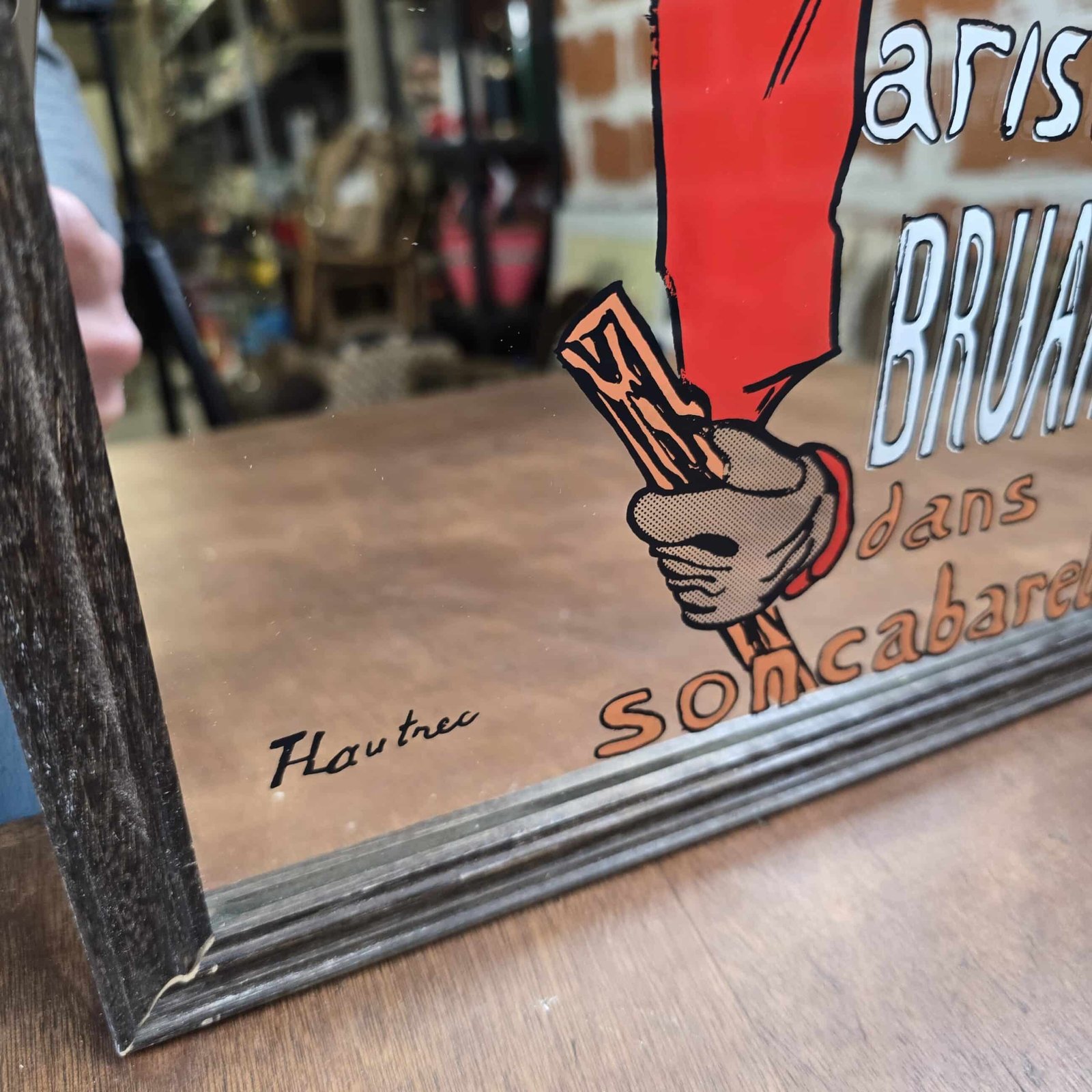 L’œuvre, ici sérigraphiée sur fond miroir, combine effet vintage et esprit bistrot, dans un cadre en bois brun foncé à la patine authentique.