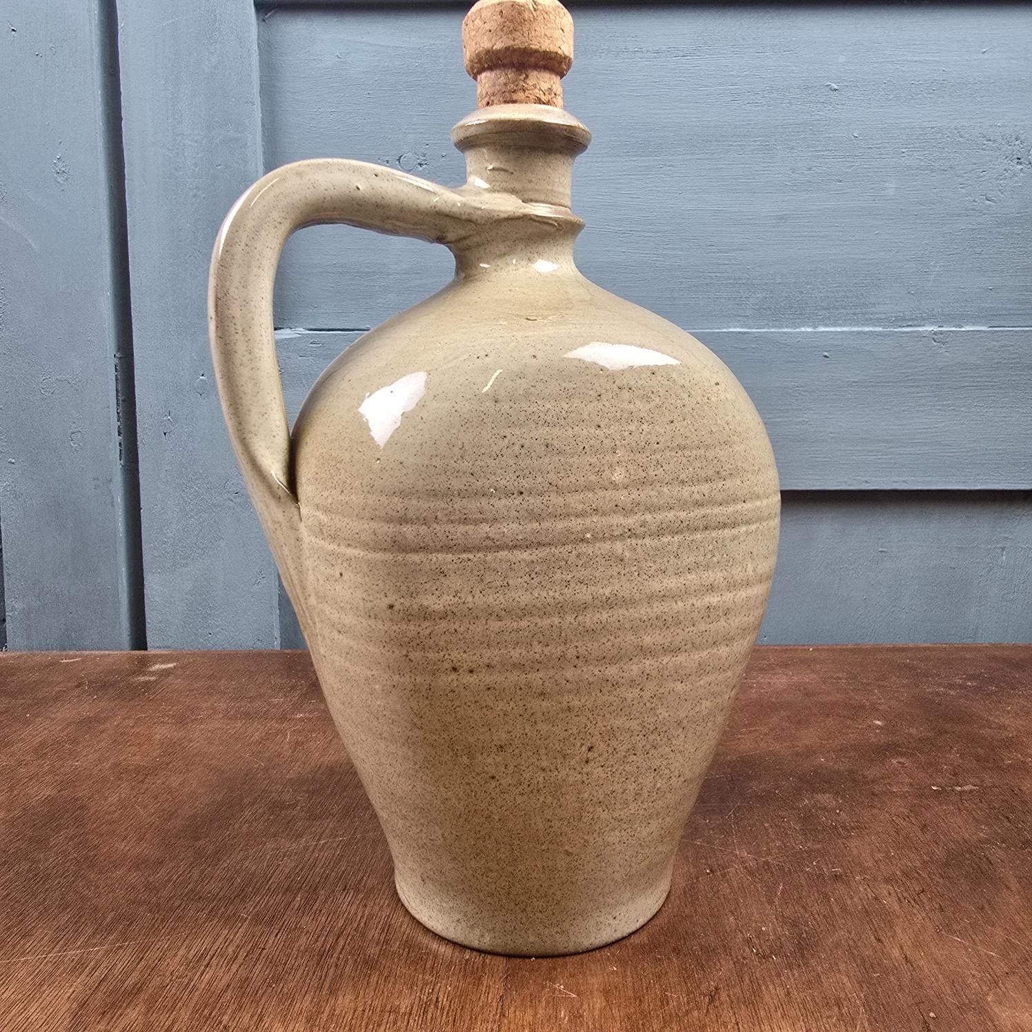 Son grès beige moucheté, subtilement nuancé, capte la lumière sans briller. La anse arrondie invite la main, le bouchon en liège d’origine est encore bien présent, et l’ensemble dégage ce charme authentique des objets utilitaires devenus décoratifs avec le temps.