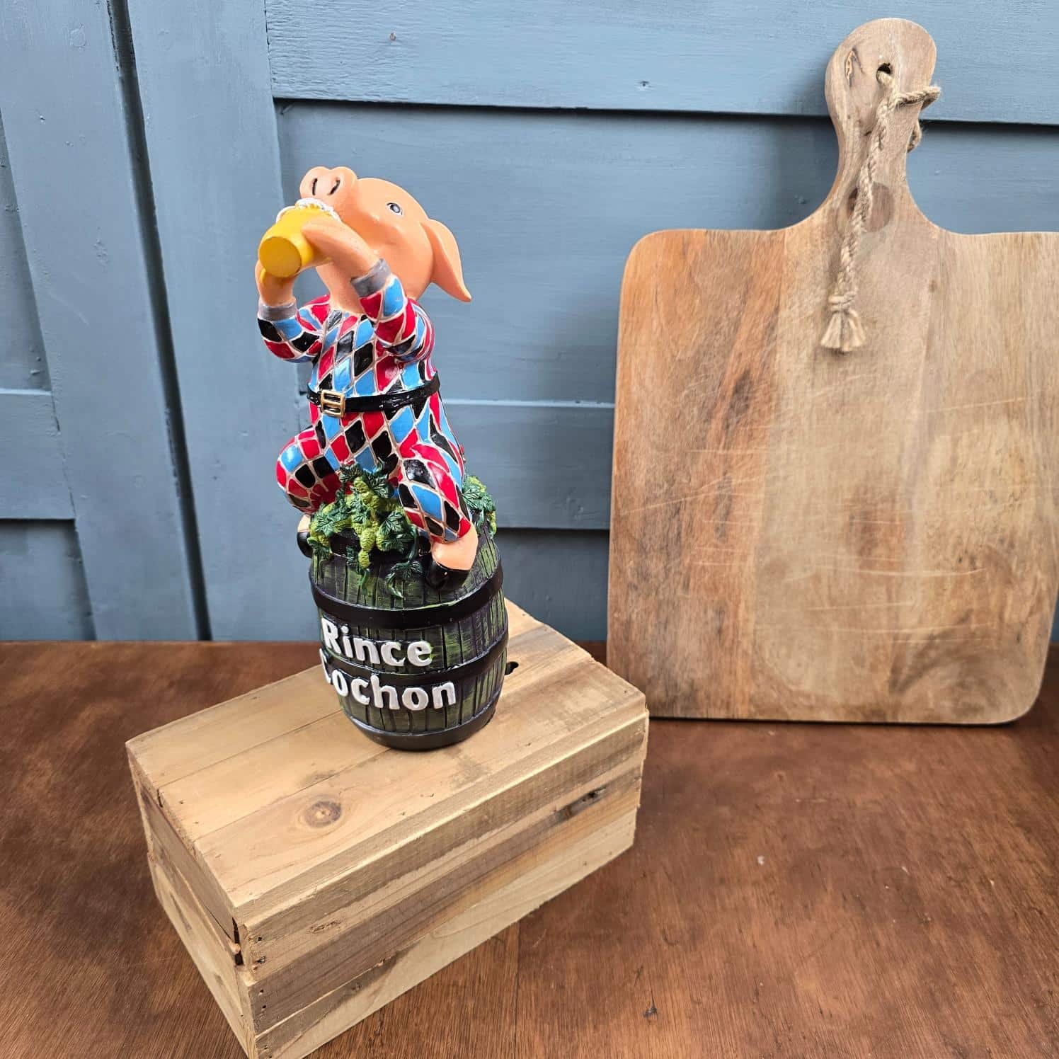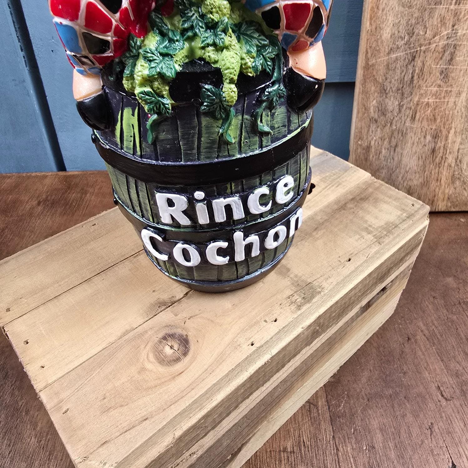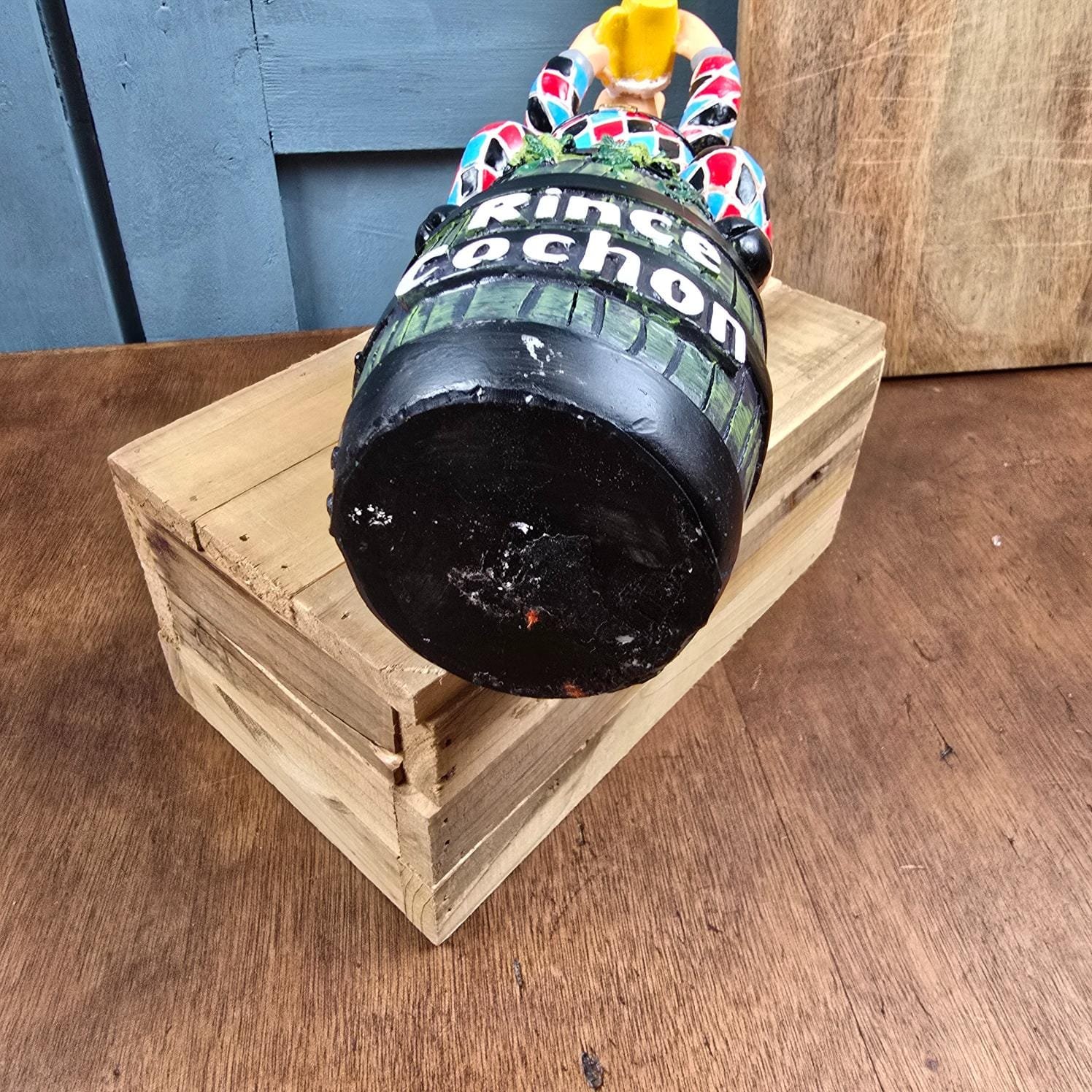 Cette statuette fait partie d’un coffret de bière Rince Cochon – édition Arlequin, édité en série limitée.
