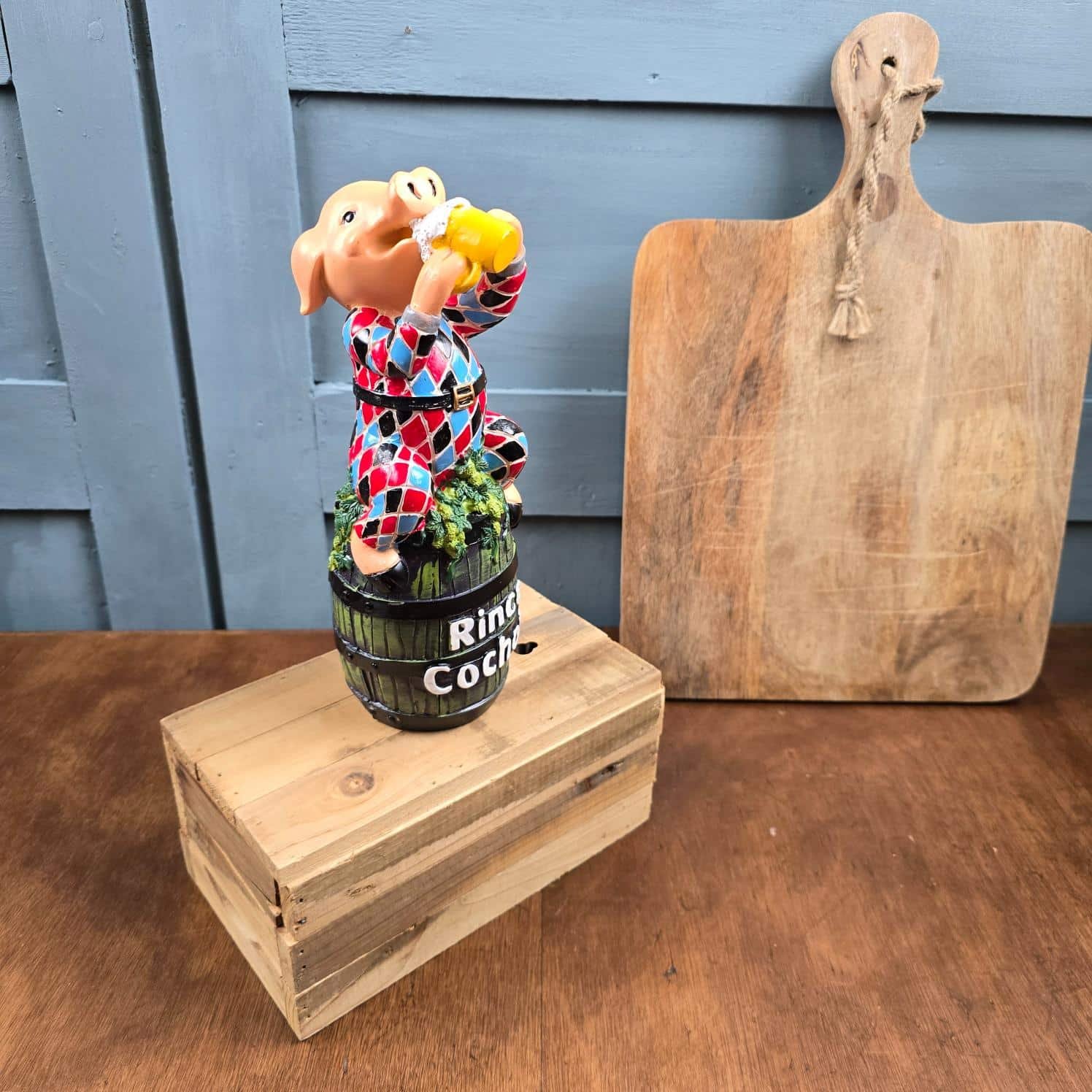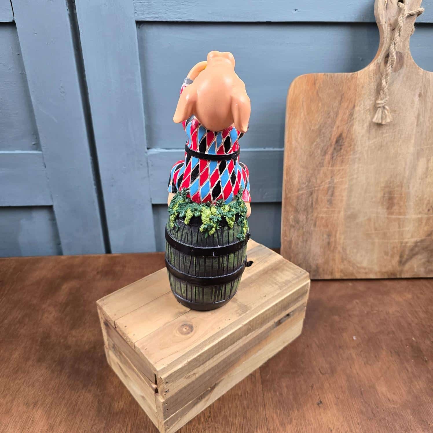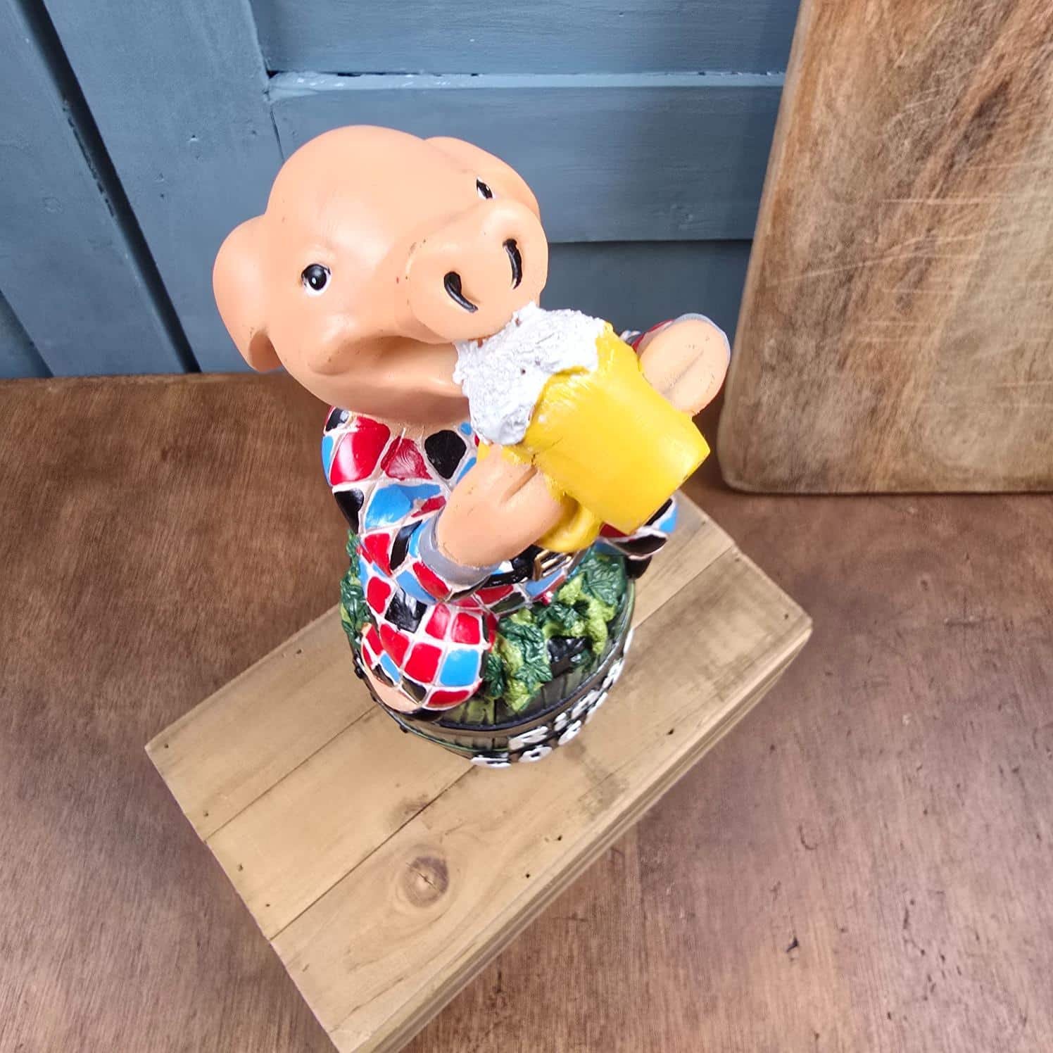 Le célèbre cochon, ici vêtu de son costume d’Arlequin aux couleurs éclatantes, lève sa chope avec une joie communicative, perché sur son tonneau emblématique.
