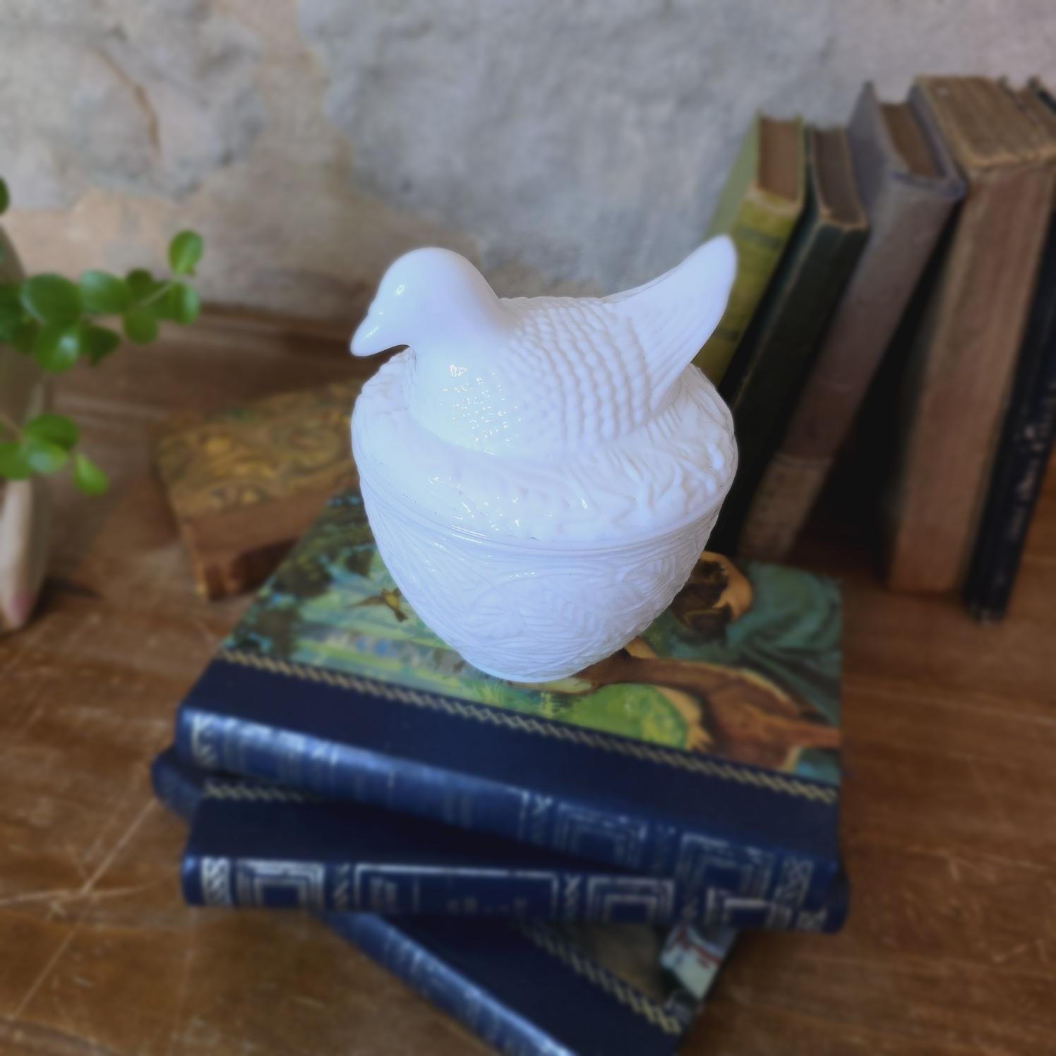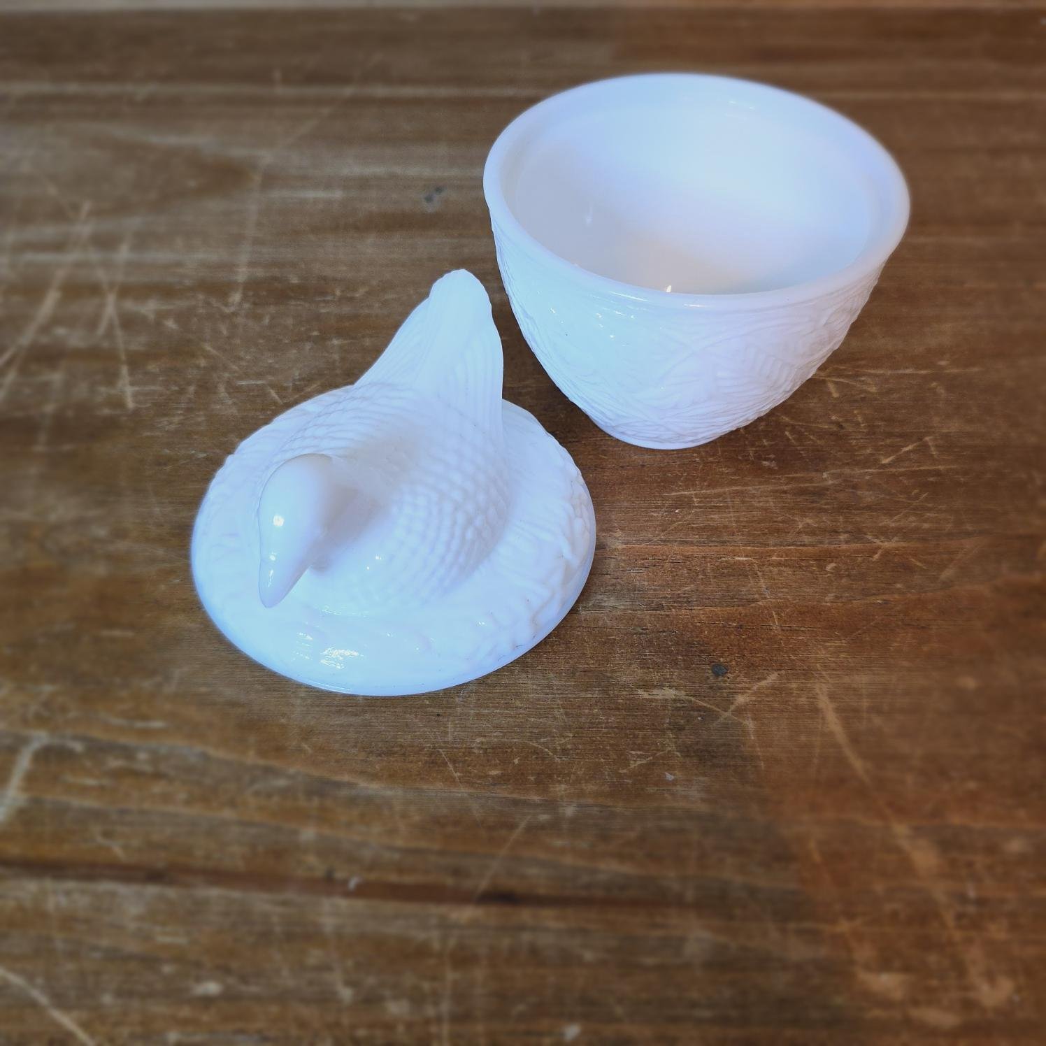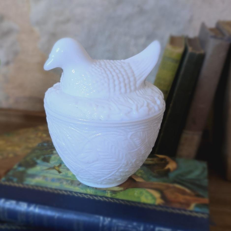 Charmante bonbonnière en verre opale blanc, signée Avon USA. Le couvercle représente un oiseau posé délicatement sur son nid, dans un décor en relief élégant et texturé. L’ensemble est d’un blanc lumineux et satiné, parfait dans une salle de bain, sur une commode ou une étagère.
