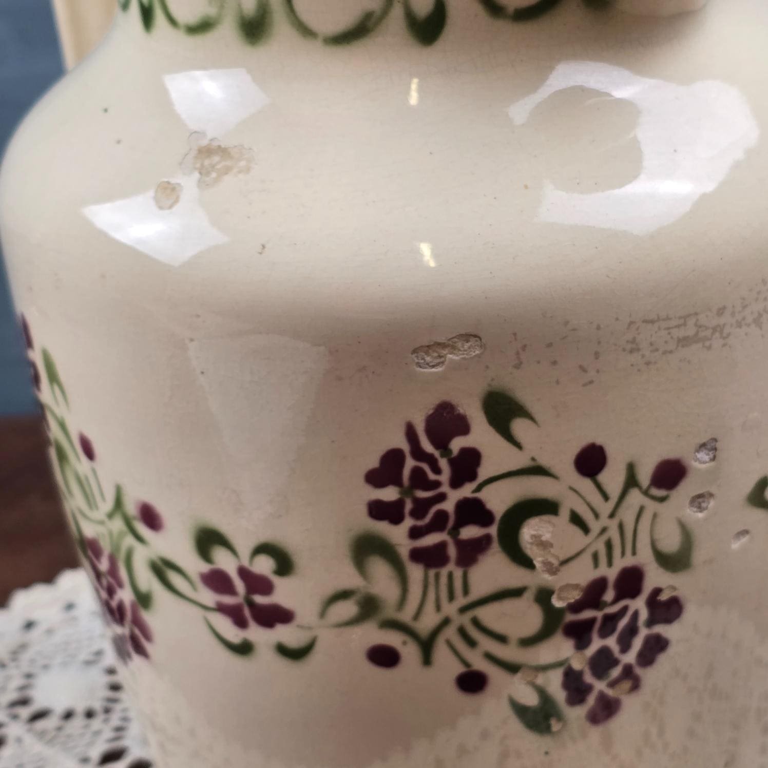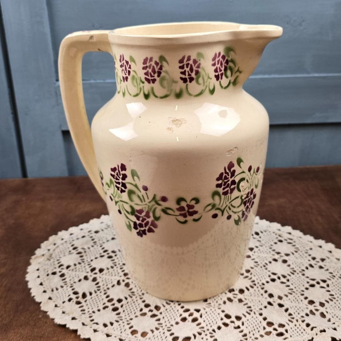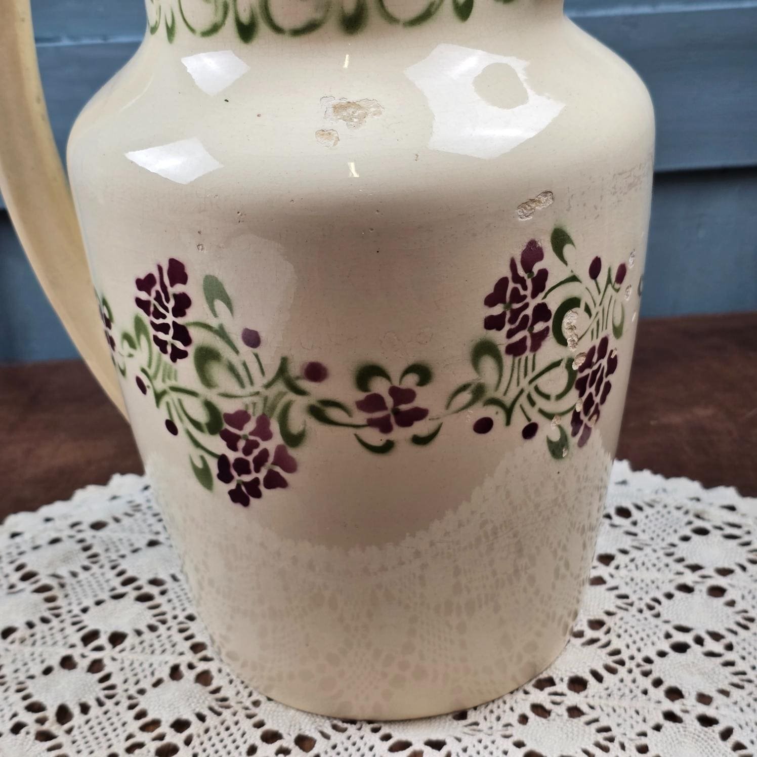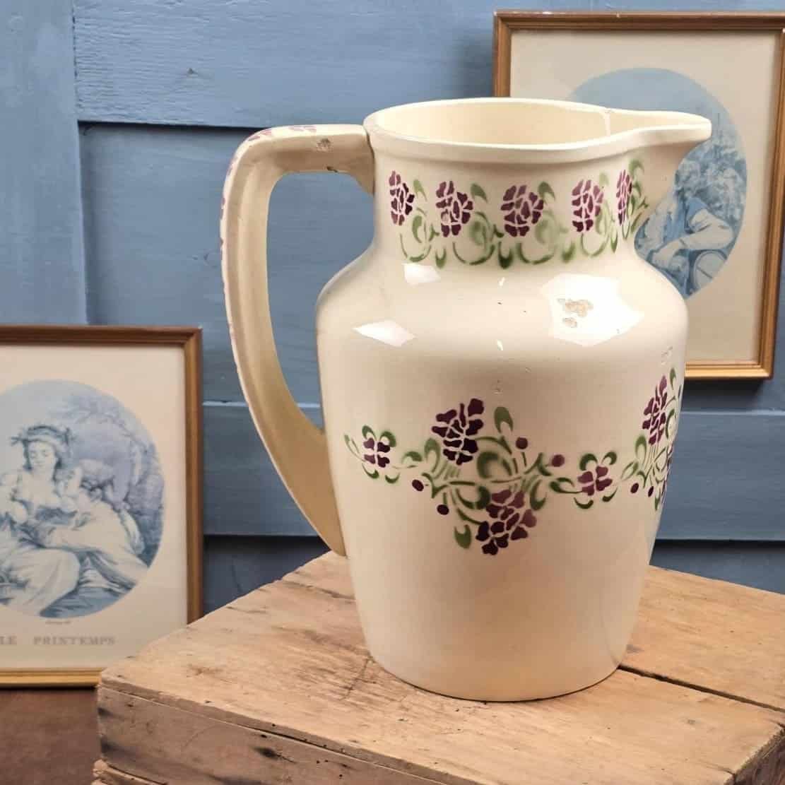 Grand broc ancien en terre de fer de la manufacture Choisy-le-Roi, décor floral violet et vert appliqué au pochoir.