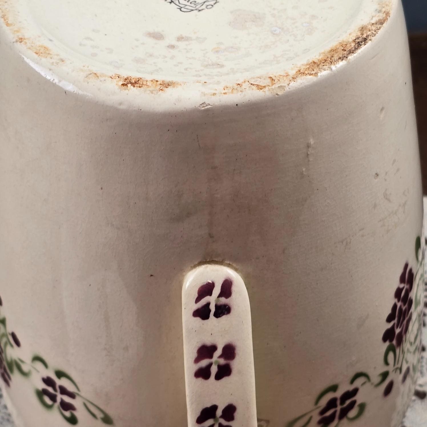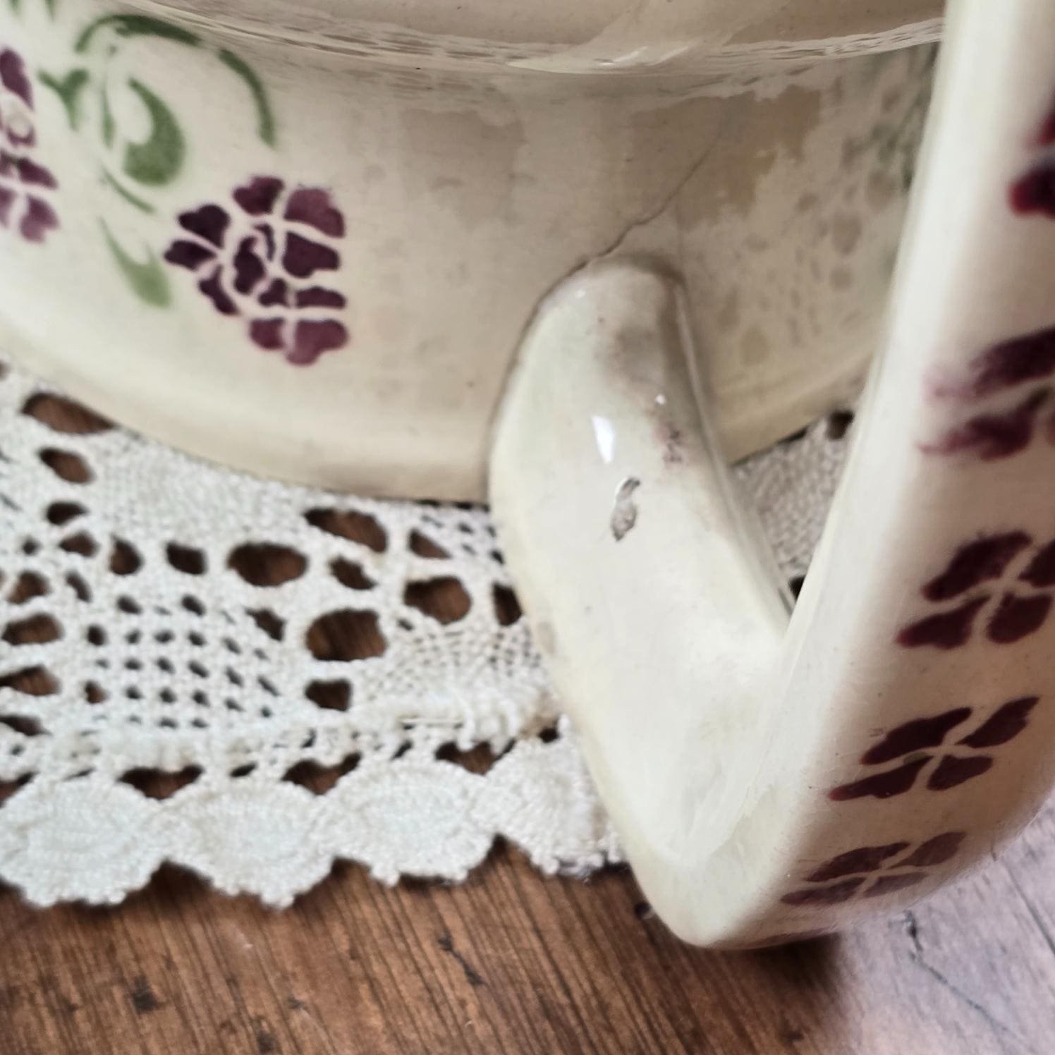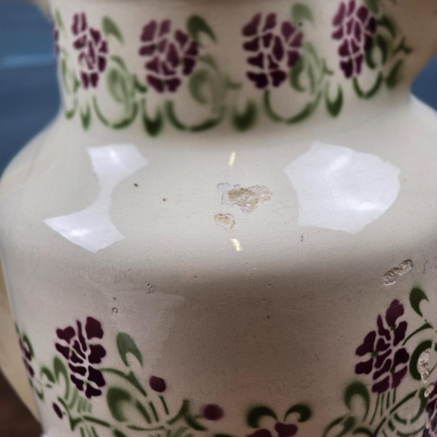 Grand broc ancien en terre de fer de la manufacture Choisy-le-Roi, décor floral violet et vert appliqué au pochoir.