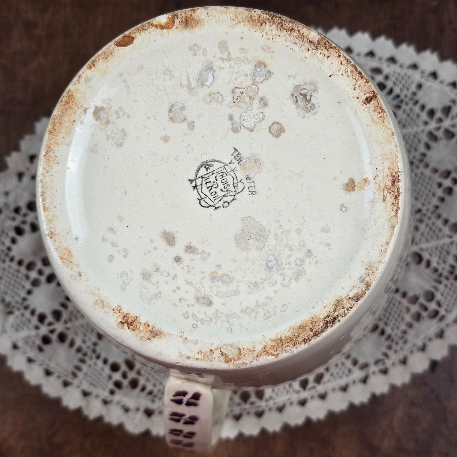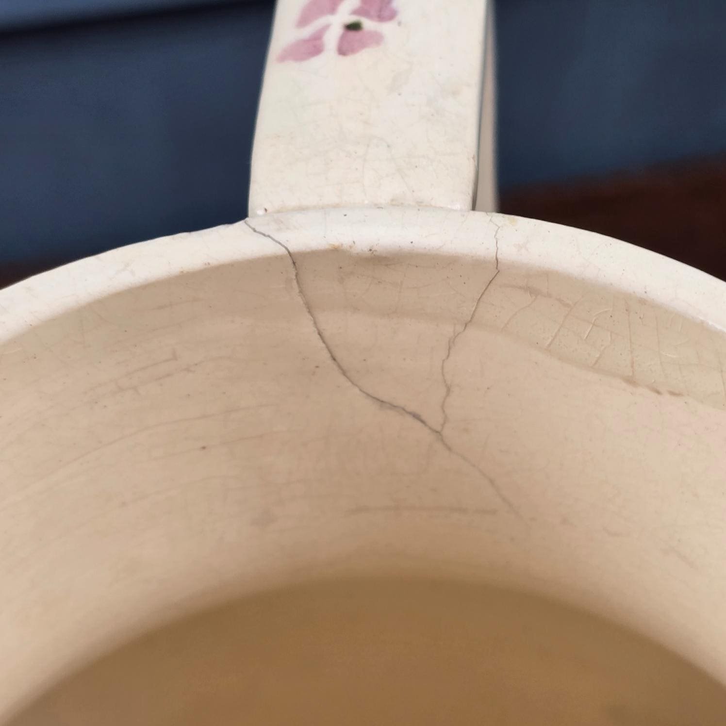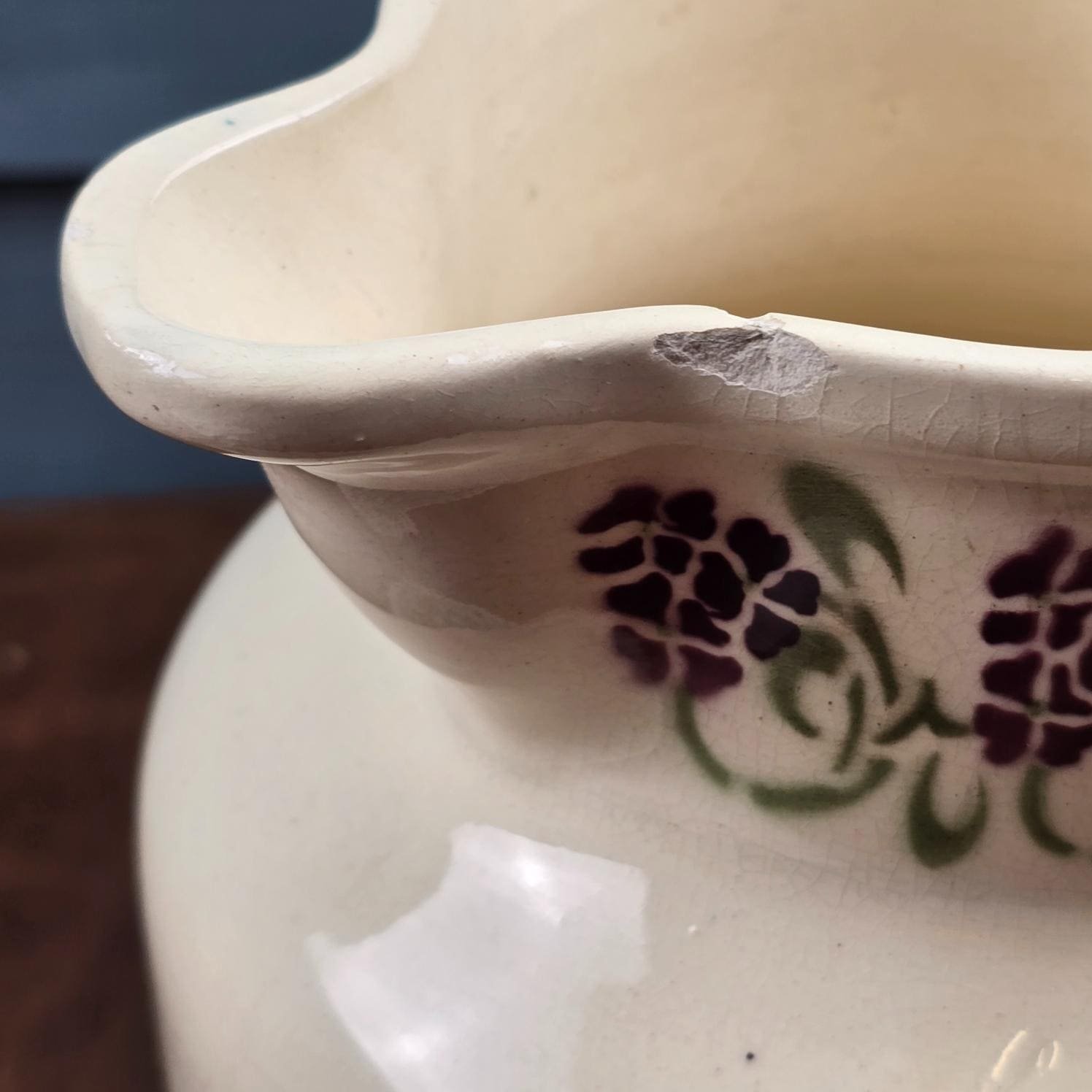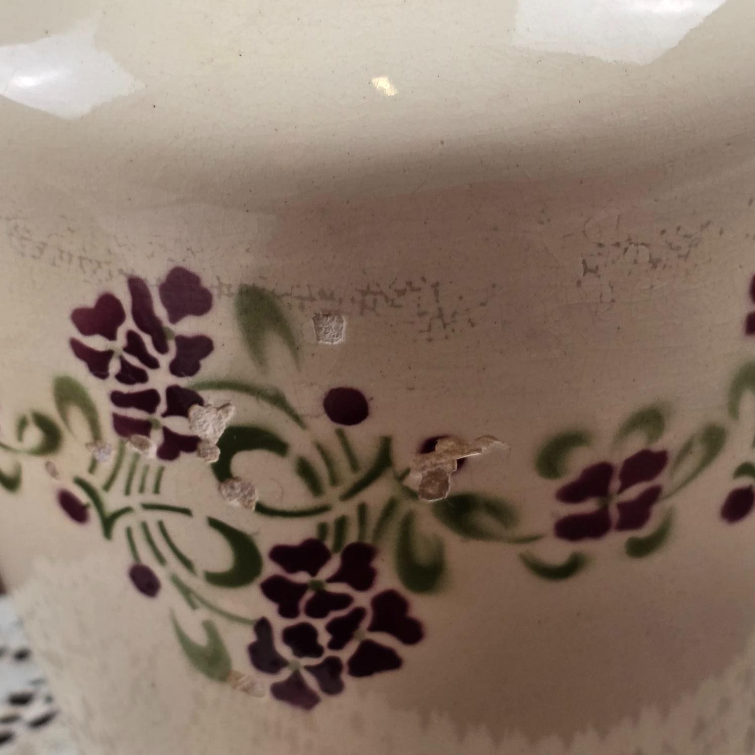 Grand broc ancien en terre de fer de la manufacture Choisy-le-Roi, décor floral violet et vert appliqué au pochoir.