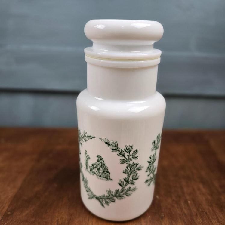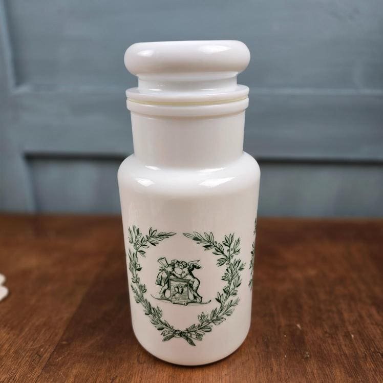 Grand pot ancien en verre opale – Décor vert romantique, style apothicaire – Made in Italy