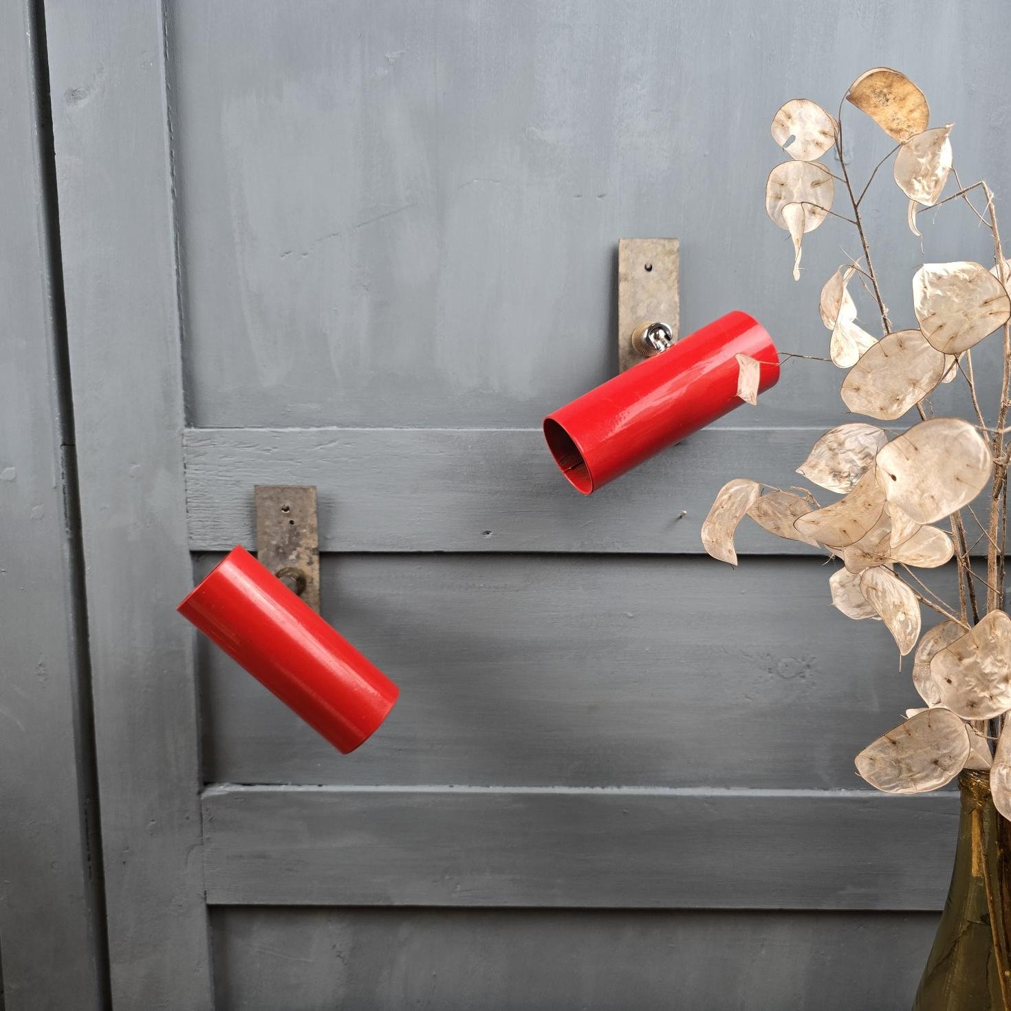 Ce lot de deux spots muraux vintage séduit par son rouge franc et vibrant, typique des intérieurs audacieux de la seconde moitié du XXe siècle. Leur forme tubulaire, sobre et graphique, apporte immédiatement une touche industrielle et rétro à un mur, une étagère ou une mise en scène décorative.